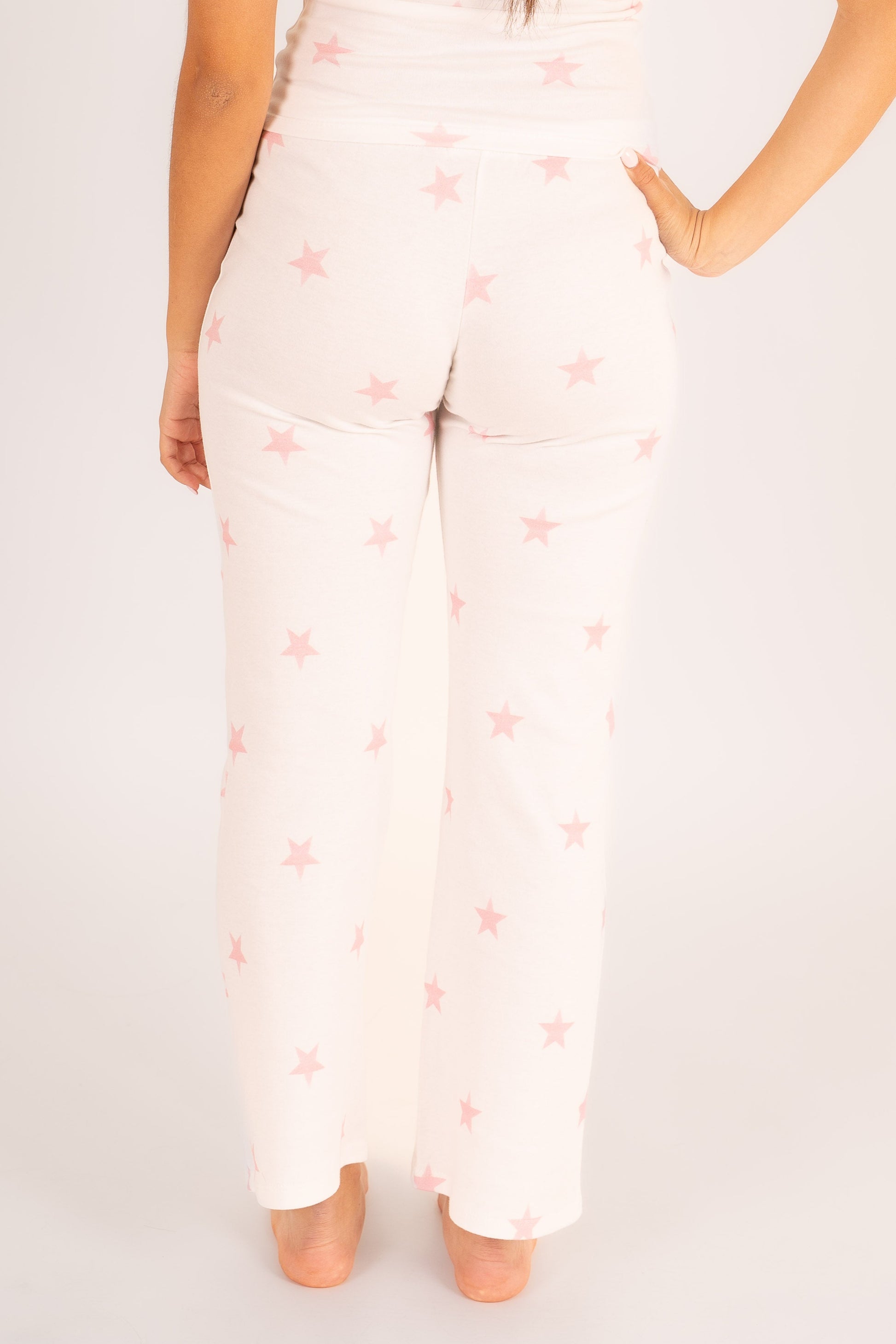 Cotton pajama pants with pink star print, comfortable fit.